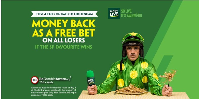 MONEY BACK SPECIAL FOR DAY THREE!! Money Back as a Free Bet on All Losers if the SP Fav Wins. Applies to the first 4 races at Cheltenham on Thursday. Max bet £/€10 (T&Cs Apply) http://pdy.pr/PhId3I