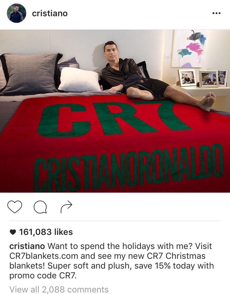 Cristiano Ronaldo, multi millionaire, selling his new blankets, which are ‘super soft and plush’. Wow.
