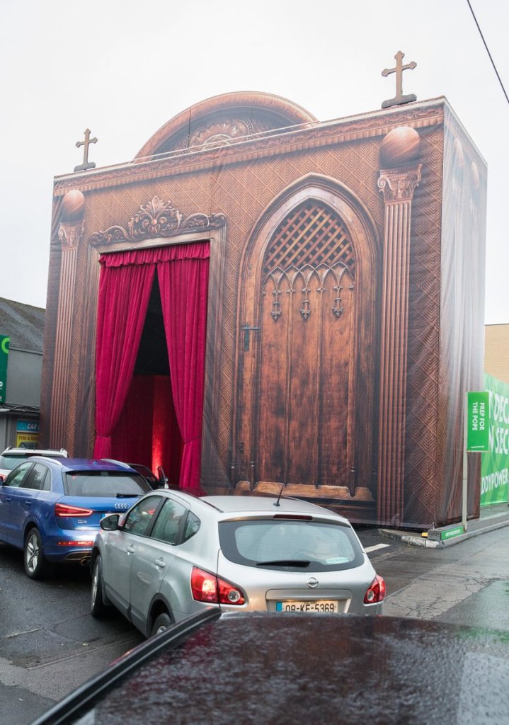 Ahead of @Pontifex‘s visit this weekend, we thought we’d erect a drive-thru confession box, to enable the people of Ireland to repent decades of sins in mere seconds…